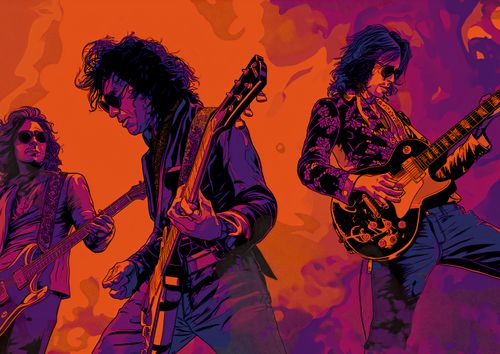 Plakat z serii pop art zatytułowany Mamy To Flow. Obrazuje trzech gitarzystów zanurzonych w pasji muzyki, z instrumentami w rękach, oddając ducha rock'n'rolla. Intensywne kolory, w tym głębokie odcienie pomarańczu i fioletu, tworzą tło, które pulsują energią i rytmem. Plakat oddaje esencję koncertowej atmosfery i jest hołdem dla klasycznych rockowych wirtuozów. Znakomicie wpasuje się w przestrzenie kulturalne, takie jak sale koncertowe, studia muzyczne, jak również jako żywiołowy akcent dekoracyjny w młodzieżowych pokojach czy salonach miłośników muzyki.