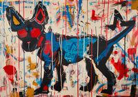Plakat z serii abstrakcja zatytułowany Miejski Pies. Żywa kompozycja przedstawia sylwetkę psa w stylu street art w której dominują kolory takie jak czerwień, niebieski i żółty, które są rozmieszczone na płótnie w sposób dynamiczny i spontaniczny. Praca wydaje się być pełna ruchu dzięki pociągnięciom pędzlem i kroplom farby rozpryskującym się w różnych kierunkach. Na pierwszy plan wyłania się czarna sylwetka psa, której kontury są podkreślone kontrastującymi barwami i szkicowym stylem. W tle można dostrzec chaotyczne linie i formy, które mogą symbolizować miejski chaos i energię, a także fragmenty tekstu, które dodają dziełu charakteru ulicznego muralu. Całość sprawia wrażenie radosnej i pełnej energii ekspresji artystycznej. Świetnie sprawdzi się w nowoczesnych przestrzeniach miejskich.