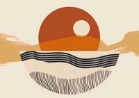 Plakat z serii boho zatytułowany Pół na Całość. Plakat przedstawia uproszczony, geometryczny krajobraz, w którym słońce jest głównym bohaterem, stanowiąc centralny punkt kompozycji. Jego okrągły kształt dominuje na tle abstrakcyjnych wzgórz i falujących linii, które mogą przypominać wzburzone morze lub piaszczyste wydmy. Kolorystyka plakatu to spokojna paleta ciepłych odcieni pomarańczu, beżu i czerni, która nadaje dziełu głębi i kontrastu.Ten plakat będzie wspaniałym dodatkiem do wnętrz urządzonych w ciepłych, ziemistych barwach, gdzie może dodać nowoczesnego charakteru. Idealnie sprawdzi się jako punkt centralny w przestrzeniach, które korzystają z naturalnego światła, takich jak salony, gabinety czy przestronne hole.