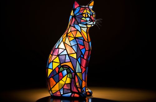 Plakat z serii abstrakcja zatytułowany Koci Witraż. Ten plakat przedstawia artystyczną ilustrację kota, który jest stylizowany na witraż. Zwierzę jest zbudowane z wielu kolorowych, geometrycznych kształtów, które przypominają szklane fragmenty witraża. Barwy są żywe i różnorodne, z przewagą odcieni niebieskiego, czerwonego, żółtego i pomarańczowego, tworząc wizualną ucztę, która zarówno przykuwa uwagę, jak i przyjemnie dla oka. Kot jest przedstawiony w profilu, siedząc z eleganckim, dostojnym położeniem, co dodaje ilustracji majestatycznego charakteru. Tło jest proste i ciemne, co pozwala na to, aby kolory kota były jeszcze bardziej wyraziste. Ta praca może być interpretowana jako hołd dla klasycznej formy sztuki, jaką jest witraż, połączony z nowoczesną grafiką cyfrową, tworząc unikalne i współczesne dzieło sztuki.