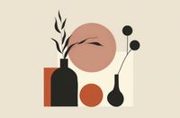 Plakat z serii boho zatytułowany Stół Roślin. Plakat przedstawia stilizowaną kompozycję abstrakcyjnych form, które mogą przypominać wazony z roślinami. Czarny, silnie zarysowany wazon po lewej stronie kontrastuje z bardziej płynnymi kształtami i ciepłymi odcieniami czerwieni i beżu, tworząc zrównoważoną, ale dynamiczną scenę. Rośliny są zredukowane do najprostszych form, co nadaje im elegancki, graficzny charakter. Prostota linii i ograniczenie detali podkreślają minimalistyczny charakter pracy. Świetnie sprawdzi się jako dekoracja w nowoczesnych, minimalistycznych przestrzeniach, gdzie może służyć jako subtelny, ale wyraźny akcent. Idealnie nadaje się do umieszczenia w salonie, sypialni lub biurze, oferując spokojny motyw przyrody w abstrakcyjnej formie, który może inspirować do refleksji i kreatywności.