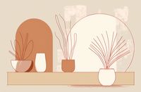 Plakat z serii boho zatytułowany Widok Roślin. Plakat przedstawia trzy stylizowane donice z roślinami, umieszczone na półce w harmonijnym ułożeniu, na tle geometrycznych kształtów w ciepłych, pastelowych kolorach. Proste linie i spokojne barwy tworzą atmosferę relaksu i spokoju, a subtelne tekstury dodają głębi i zainteresowania.Świetnie sprawdzi się w wnętrzach, które cenią sobie spokój i naturalne elementy, takich jak jasne salony, przytulne sypialnie lub miejsca wypoczynku. Jest to idealny wybór dla miłośników minimalizmu i skandynawskiej estetyki.