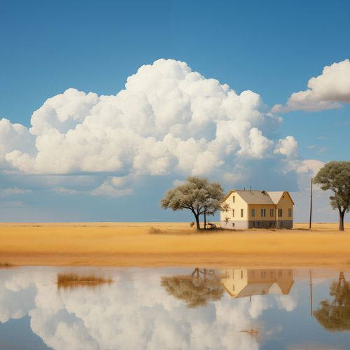 Plakat z serii pejzaże zatytułowany Domostwo, przedstawia idylliczny krajobraz z domem wiejskim, który odzwierciedla siatkę spokoju i prostoty. W centrum sceny znajduje się tradycyjny dom z jasnożółtymi ścianami i dachem w kolorze jasnoszarym, otoczony przez dwa okazałe drzewa oferujące cień i komfort. Płaski, rozległy krajobraz pokryty jest suchą, złotą trawą, która kontrastuje z błękitnym, rozległym niebem usianym puszystymi białymi chmurami. Poniżej, spokojna, błyszcząca tafla wody odbija dom i drzewa, tworząc doskonałe lustrzane odbicie, które dodaje głębi i symetrii kompozycji. Ten obraz przypomina o prostych przyjemnościach życia na wsi, gdzie czas wydaje się płynąć wolniej, a natura jest blisko. Idealnie wpasuje się w przestrzenie, które mają na celu wywołać poczucie spokoju i refleksji, takie jak domowe pokoje wypoczynkowe, gabinety psychoterapeutyczne lub pomieszczenia do medytacji.