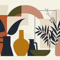 Plakat z serii minimalistyczne zatytułowany Formy Stylu. Grafika ta przedstawia abstrakcyjne kompozycje różnych form geometrycznych i roślin. Centralne miejsce zajmują stylizowane wazony i doniczki w ciepłych odcieniach brązu, żółci i czerni, które są przeplatają się z roślinami w odcieniach zielonym i czarnym. Tło składa się z nieregularnych bloków kolorów w stonowanych odcieniach beżu, pomarańczy i szarości, tworzących spokojny i uporządkowany układ.Ten plakat będzie doskonale komponować się we wnętrzach utrzymanych w nowoczesnym, minimalistycznym stylu, gdzie dominują czyste linie i neutralna paleta kolorów.