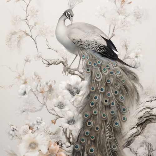 Plakat z serii wnętrza zatytułowany Pawia Gracja. Ta grafika przedstawia majestatycznego pawia spoczywającego na gałęzi, otoczonego przez delikatne kwiaty magnolii. Kunsztownie oddane detale piór i kwiatów w pastelowej palecie barw tworzą uczucie spokoju i harmonii. Plakat ten jest idealny dla miłośników piękna natury i sztuki, doskonale nadaje się do wnętrz o klasycznej i eleganckiej estetyce, takich jak salon, sypialnia, a także jako wyjątkowy element dekoracyjny w spa lub miejscach relaksacji.