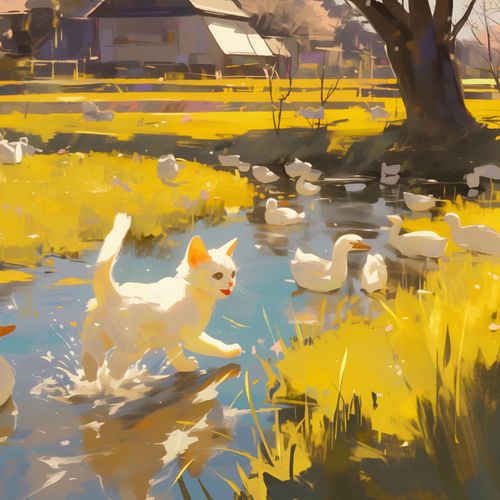 Plakat z serii abstrakcja zatytułowany Słońce na Wsi. Przedstawia idylliczną, słoneczną scenę na wsi, gdzie głównymi bohaterami są bawiący się kotek i grupa kaczek w tle. Kot, o białym umaszczeniu z jasnymi plamami, jest uchwycony w ruchu, co nadaje scenie dynamiki. Kaczki spokojnie pływają po lustrzanej tafli wody, otoczonej przez żywo żółtą trawę, co tworzy kontrast z białym kotem. Światło słoneczne rozświetla scenę, nadając jej ciepły, przyjemny nastrój. Plakat ma wyraźnie impresjonistyczny charakter, z luźnymi pociągnięciami pędzla i żywymi plamami kolorów, co czyni go atrakcyjnym dla tych, którzy cenią sobie wiejski spokój i piękno natury. Idealnie pasowałby do wnętrz, które mają na celu stworzenie atmosfery relaksu i spokoju, jak pokoje dzienne, przestrzenie odpoczynkowe, a nawet pokoje dla dzieci.