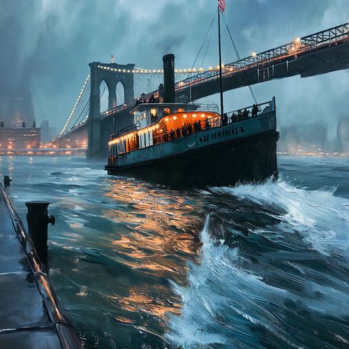 Plakat z serii abstrakcja zatytułowany Stary Parowiec uchwycił nostalgiczny obraz starego parowca przemierzającego wody przy mrocznym niebie, z tłem rozświetlonego mostu. Światła na parowcu rzucają ciepły blask na fale, tworząc złoty refleks na powierzchni wody, co kontrastuje z chłodnymi odcieniami burzowych chmur i zmierzchu. To malownicze przedstawienie, połączone z dynamiczną grą świateł i cieni, tworzy romantyczną i pełną atmosfery scenę, która przyciąga oko i wywołuje uczucie sentymentu do dawnych czasów. Idealnie nadaje się do zawieszenia w przestrzeniach, gdzie chcemy dodać element historycznej elegancji i marzycielskiego nastroju, takich jak biblioteki, studia, a nawet salony.