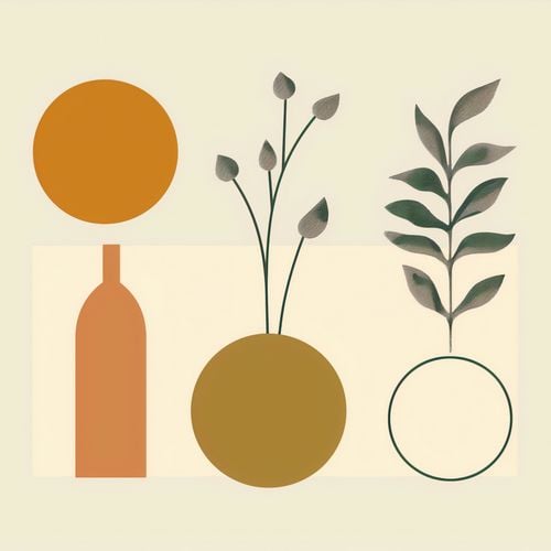 Plakat z serii boho zatytułowany Symfonia Równowagi. Plakat łączy organiczne kształty roślin z rygorystyczną formą geometrii. Prezentuje on wazony w spokojnych odcieniach brązu i złota, z których jeden jest ozdobiony gałązkami z delikatnymi pąkami, a drugi pokazuje symetryczny wzór liści. Proste linie i figury geometryczne, takie jak okrąg i prostokąt, tworzą tło dla roślinności, przypominając o ludzkiej próbie ujarzmienia natury. Całość osadzona na pastelowym tle wywołuje uczucie spokoju i harmonii. To dzieło będzie pasowało do przestrzeni, które cenią równowagę między naturą a stworzonym przez człowieka porządkiem, jak eleganckie gabinety, przestrzenie wellness lub strefy odpoczynku, które dążą do stworzenia oazy spokoju w zabieganym świecie.