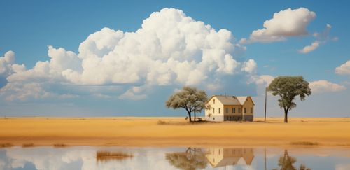 Plakat z serii pejzaże zatytułowany Domostwo, przedstawia idylliczny krajobraz z domem wiejskim, który odzwierciedla siatkę spokoju i prostoty. W centrum sceny znajduje się tradycyjny dom z jasnożółtymi ścianami i dachem w kolorze jasnoszarym, otoczony przez dwa okazałe drzewa oferujące cień i komfort. Płaski, rozległy krajobraz pokryty jest suchą, złotą trawą, która kontrastuje z błękitnym, rozległym niebem usianym puszystymi białymi chmurami. Poniżej, spokojna, błyszcząca tafla wody odbija dom i drzewa, tworząc doskonałe lustrzane odbicie, które dodaje głębi i symetrii kompozycji. Ten obraz przypomina o prostych przyjemnościach życia na wsi, gdzie czas wydaje się płynąć wolniej, a natura jest blisko. Idealnie wpasuje się w przestrzenie, które mają na celu wywołać poczucie spokoju i refleksji, takie jak domowe pokoje wypoczynkowe, gabinety psychoterapeutyczne lub pomieszczenia do medytacji.