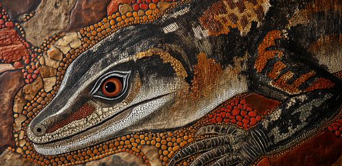 Plakat z serii abstrakcja zatytułowany Oko Jaszczurki. Fascynujące dzieło sztuki przedstawia zbliżenie na oko jaszczurki, które jest wykonane z niezwykłą dbałością o detale. Bogata faktura skóry zwierzęcia oraz użycie techniki przypominającej pointylizm sprawiają, że plakat zyskuje trójwymiarową głębię i realizm. Dynamiczna paleta barw, od głębokich odcieni brązu po złote i pomarańczowe akcenty, podkreśla dziką i pierwotną esencję natury. Plakat ten idealnie wpasuje się w dekoracje wnętrz o tematyce przyrodniczej, jak również stanowić może wyrazisty element w przestrzeniach edukacyjnych, takich jak sale biologiczne czy przyrodnicze, a także jako elegancki akcent w przestrzeniach mieszkalnych dla miłośników natury i dzikiej fauny.