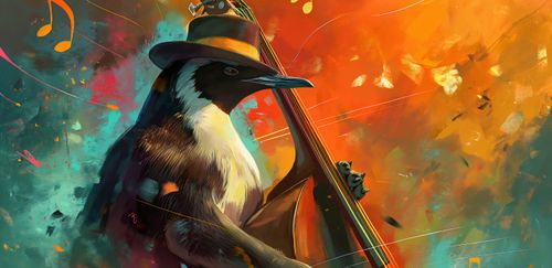 Plakat z serii abstrakcja zatytułowany Pingwinia Nuta. Przedstawia figurę pingwiniego muzyka, elegancko ubranego, grającego na kontrabasie. Ptak nosi klasyczny kapelusz, który dodaje mu artystycznego charakteru, a jego pióra delikatnie przechodzą w struny instrumentu, co tworzy efekt płynnego połączenia muzyki z naturą. Tło plakatu rozświetlone jest ciepłymi, żywymi barwami oraz abstrakcyjnymi kształtami, które przypominają rozsypane nuty i dynamiczny ruch jazzowej melodii. Ten plakat idealnie nada się do wnętrz o muzycznym duszu, takich jak sale koncertowe, studia nagraniowe, jazzowe kluby lub nawet domowe przestrzenie dla miłośników muzyki. Wizualizuje on pasję do muzyki i jej wpływ na otaczającą nas przestrzeń, jednocześnie wprowadzając element wyrafinowanego stylu.