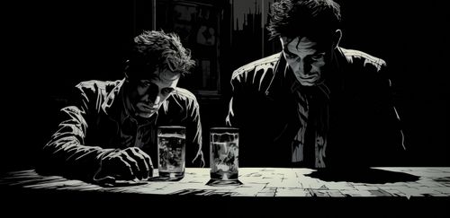 Plakat z serii abstrakcja zatytułowany Spiskowcy. Ta grafika przedstawia dwóch mężczyzn zanurzonych w głębokiej konwersacji przy barowym stole. Stylizacja na czarno-biało uchwyciła napięte, dramatyczne oświetlenie i cienie, które nadają scenie klimat tajemniczości i suspensu. Wyraźne kontury i kontrastowe światłocienie podkreślają wyraziste postaci mężczyzn i ich zacięte postawy. Plakat ten przemawia do miłośników klasycznego kina i literatury, doskonale nadając się do dekoracji przestrzeni o męskim charakterze, takich jak prywatne gabinety, domowe bary czy miejsca spotkań.