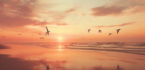 Plakat z serii pejzaże zatytułowany Spokojna Przystań przedstawia idylliczny wschód słońca nad morzem, gdzie złociste promienie światła tańczą po delikatnie falującej powierzchni wody. Sylwetki mew unoszących się na ciepłym powietrzu dodają uczucia wolności i bezkresu. Rozmyte odbicia ptaków na mokrym piasku nadmorskim wzbudzają uczucie spokoju i kontemplacji. Ten plakat jest kwintesencją ukojenia, idealny do wnętrz o tematyce nadmorskiej, czy to w prywatnych rezydencjach pragnących złapać oddech od miejskiego zgiełku, jak i w przestrzeniach wellness, spa, czy hotelowych lobby, gdzie głównym celem jest relaks i odprężenie.