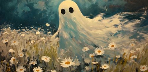 Plakat z serii abstrakcja zatytułowany Widmo Dawnej Łąki.Plakat przedstawia sympatyczną, uproszczoną postać ducha unoszącego się nad łąką pełną białych stokrotek. Duch ma duże, okrągłe oczy, co nadaje mu przyjazny wygląd. Tło to dynamicznie namalowane pociągnięcia pędzlem w odcieniach niebieskiego i brązu, co sprawia wrażenie burzowego nieba lub wschodzącej burzy. Postać ducha kontrastuje z ciemniejszym tłem, a jasne, żywe kolory kwiatów dodają kompozycji ciepła i lekkości. To połączenie elementów może symbolizować nadzieję i pokój w obliczu przeciwności, nadając plakatowi głębsze znaczenie. Idealny do dekoracji wnętrz dla osób ceniących sobie odrobinę humoru i optymizmu.