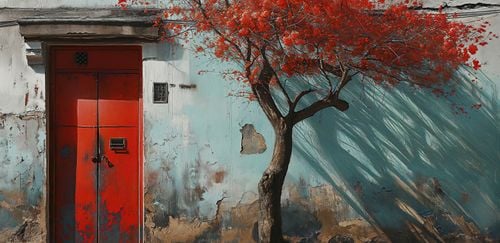Plakat z serii wnętrza zatytułowany Widok Na Dawne. Kompozycja łączy surowość starych, połatanych ścian w stonowanych kolorach z wyrazistym czerwonym drzwiami oraz rozkwitłym drzewem o żywym karmazynowym kolorze, które zdaje się wprowadzać życie i energię do miejskiej monotonii. Promienie światła przenikające przez liście dodają głębi i tajemniczości scenie. Ten plakat doskonale wkomponuje się w przestrzenie kreatywne, galerie sztuki lub jako akcent w minimalistycznych, nowoczesnych wnętrzach, przynosząc z sobą odrobinę miejskiego romansu i poezji codzienności.