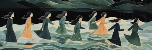 Plakat z serii wnętrza zatytułowany Nocna Procesja, przedstawia sylwetki kobiet, idących w rytmicznym ruchu przez wody, pod tajemniczym, gwiaździstym niebem. Styl plakatu, z płynnymi liniami i miękkimi pastelowymi kolorami, tworzy uczucie spokoju i onirycznej atmosfery. Postacie są przedstawione w ruchu, z włosami rozwianymi przez nocny wiatr, co dodaje dziełu poczucia tajemnicy i ruchu. Ten plakat idealnie nadaje się do wnętrz, które chcą wyrazić poczucie spokoju, introspekcji oraz kobiecej siły i solidarności, takich jak prywatne biblioteki, pokoje medytacyjne, a także przestrzenie publiczne, które pragną inspirować swoich gości do głębszego zastanowienia się nad otaczającym ich światem.