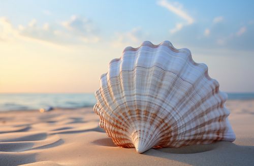 Plakat z serii natura zatytułowany Echo Morza. Delikatne, pastelowe barwy muszli występujące na pierwszym planie, z jej wyraźnymi liniami i subtelnym przejściem kolorów od kremowego do różowego, kontrastują z dynamicznym tłem zachodzącego słońca nad morzem. Złote refleksy światła na wodzie i miękki, piaskowy pierwszy plan tworzą poczucie głębi i spokoju. Idealny do wnętrz o tematyce morskiej, relaksacyjnych spa oraz jako element dekoracyjny w pokojach hotelowych z widokiem na morze.