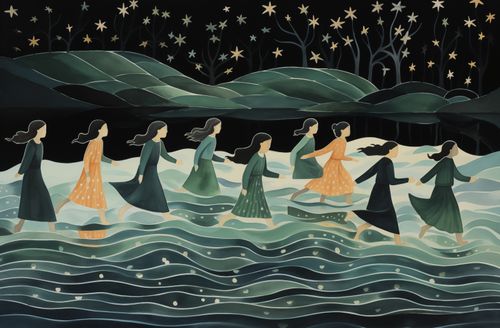Plakat z serii wnętrza zatytułowany Nocna Procesja, przedstawia sylwetki kobiet, idących w rytmicznym ruchu przez wody, pod tajemniczym, gwiaździstym niebem. Styl plakatu, z płynnymi liniami i miękkimi pastelowymi kolorami, tworzy uczucie spokoju i onirycznej atmosfery. Postacie są przedstawione w ruchu, z włosami rozwianymi przez nocny wiatr, co dodaje dziełu poczucia tajemnicy i ruchu. Ten plakat idealnie nadaje się do wnętrz, które chcą wyrazić poczucie spokoju, introspekcji oraz kobiecej siły i solidarności, takich jak prywatne biblioteki, pokoje medytacyjne, a także przestrzenie publiczne, które pragną inspirować swoich gości do głębszego zastanowienia się nad otaczającym ich światem.