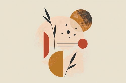 Plakat z serii boho zatytułowany Przyrost do Tła.Plakat przedstawia abstrakcyjną kompozycję złożoną z prostych, geometrycznych form i roślinnych motywów. Dominują tutaj ciepłe odcienie pomarańczowego, różu i brązu, które mieszają się z czernią i beżem. Na pierwszym planie mamy elementy roślinne, które mogą przypominać liście lub gałązki, zaś w tle znajdują się różnej wielkości i faktury koła. Całość jest stylizowana i uproszczona, co daje efekt współczesnego, designerskiego dzieła sztuki. Obraz może inspirować poczuciem spokoju i natury, jednocześnie zachowując modernistyczne uczucie. Idealnie wpasuje się w nowoczesne wnętrze jako centralny punkt dekoracyjny lub delikatne uzupełnienie estetyczne.