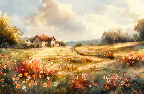 Plakat z serii abstrakcja zatytułowany Sielski Domek. Plakat ukazuje sielski krajobraz wiejski, gdzie dominuje ciepła, rozświetlona słońcem sceneria. Na pierwszym planie rozciąga się żywokolorowy dywan dzikich kwiatów, w którym dominują odcienie czerwieni, różu i bieli, nadając kompozycji żywą i radosną atmosferę. Pośrodku krajobrazu widnieje urokliwy, biały dom z czerwonym dachem, otoczony dojrzewającymi drzewami i łanami zbóż, które delikatnie falują na wietrze. W tle majaczą delikatne sylwetki wzgórz, które dopełniają harmonijny obraz sielanki. Niebo jest przestronne i dramatyczne z miękkimi, białymi chmurami, co nadaje głębi i przestrzeni całej scenie. Ten plakat emanuje spokojem i prostotą życia na wsi, jest jak okno otwierające się na spokojną, bukoliczną ucieczkę, idealne do wnętrz, które mają za zadanie wyciszać i relaksować.