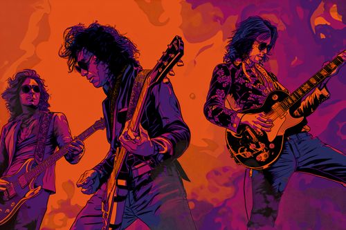 Plakat z serii pop art zatytułowany Mamy To Flow. Obrazuje trzech gitarzystów zanurzonych w pasji muzyki, z instrumentami w rękach, oddając ducha rock'n'rolla. Intensywne kolory, w tym głębokie odcienie pomarańczu i fioletu, tworzą tło, które pulsują energią i rytmem. Plakat oddaje esencję koncertowej atmosfery i jest hołdem dla klasycznych rockowych wirtuozów. Znakomicie wpasuje się w przestrzenie kulturalne, takie jak sale koncertowe, studia muzyczne, jak również jako żywiołowy akcent dekoracyjny w młodzieżowych pokojach czy salonach miłośników muzyki.