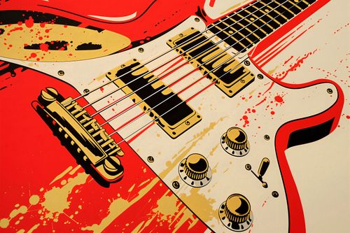 Plakat z serii abstrakcja zatytułowany Przed Graniem. Przedstawia zbliżenie na czerwoną gitarę elektryczną, której design jest wyrazisty i pełen energii. Widać detale instrumentu, takie jak przetworniki, potencjometry i struny, które są wyraźnie zaznaczone kontrastującymi kolorami złota, czerni i bieli na tle intensywnej czerwieni. Rozpryski i plamy farby na korpusie gitary nadają plakatowi surowy, rockowy charakter, co może sugerować żywiołowość i pasję muzyki granej na tym instrumencie. Ten obraz mógłby być atrakcyjnym elementem dekoracyjnym w przestrzeniach dedykowanych muzyce, takich jak sale prób, studia nagraniowe, pokoje młodzieżowe lub jako odważny akcent w nowoczesnym salonie.