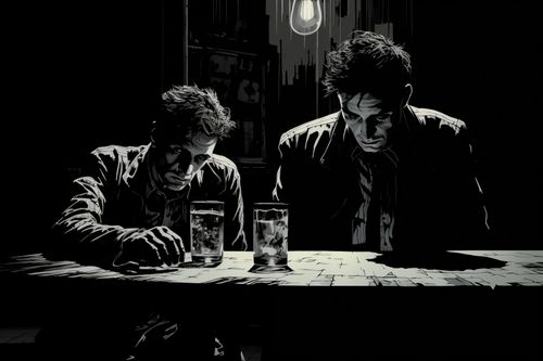 Plakat z serii abstrakcja zatytułowany Spiskowcy. Ta grafika przedstawia dwóch mężczyzn zanurzonych w głębokiej konwersacji przy barowym stole. Stylizacja na czarno-biało uchwyciła napięte, dramatyczne oświetlenie i cienie, które nadają scenie klimat tajemniczości i suspensu. Wyraźne kontury i kontrastowe światłocienie podkreślają wyraziste postaci mężczyzn i ich zacięte postawy. Plakat ten przemawia do miłośników klasycznego kina i literatury, doskonale nadając się do dekoracji przestrzeni o męskim charakterze, takich jak prywatne gabinety, domowe bary czy miejsca spotkań.