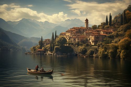 Plakat z serii pejzaże zatytułowany Spokojna Nostalgia, ten urzekający pejzaż przenosi nas do sielankowej wioski nad jeziorem, gdzie czas zdaje się płynąć wolniej. Łagodne światło rozlewające się nad architekturą wioski i gładką powierzchnią wody tworzy poczucie ciepła i spokoju. Para przemieszczająca się łodzią dodaje element ludzki, harmonijnie wpisując się w krajobraz. To dzieło sztuki idealnie nadaje się do przestrzeni, które mają na celu wprowadzenie atmosfery spokoju i refleksji, takich jak biblioteki, poczekalnie lub prywatne gabinety, zapewniając odprężającą ucieczkę od codziennego zgiełku.
