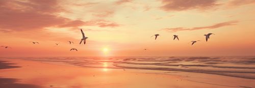 Plakat z serii pejzaże zatytułowany Spokojna Przystań przedstawia idylliczny wschód słońca nad morzem, gdzie złociste promienie światła tańczą po delikatnie falującej powierzchni wody. Sylwetki mew unoszących się na ciepłym powietrzu dodają uczucia wolności i bezkresu. Rozmyte odbicia ptaków na mokrym piasku nadmorskim wzbudzają uczucie spokoju i kontemplacji. Ten plakat jest kwintesencją ukojenia, idealny do wnętrz o tematyce nadmorskiej, czy to w prywatnych rezydencjach pragnących złapać oddech od miejskiego zgiełku, jak i w przestrzeniach wellness, spa, czy hotelowych lobby, gdzie głównym celem jest relaks i odprężenie.