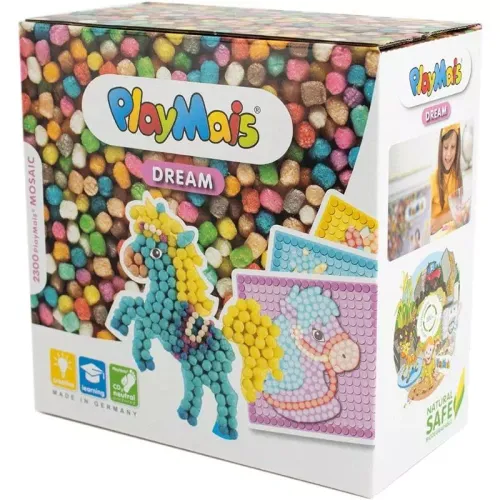 PlayMais MOSAIC DREAM to klocki w postaci chrupek ze skrobi kukurydzianej, które można łączyć ze sobą za pomocą niewielkiej ilości wody. W zestawie znajdziemy 6 kart do naklejania, na których możemy tworzyć piękne mozaiki z kucykami i nie tylko.