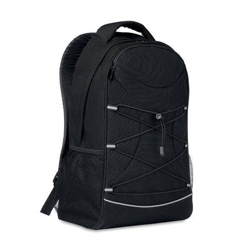 Plecak wykonany z materiału 600D RPET z odblaskowymi detalami z przodu i kieszeniami z siatki po obu stronach.