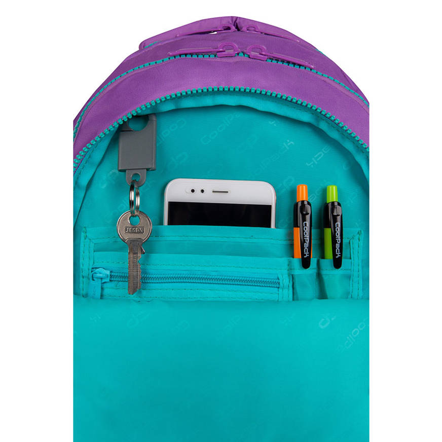 Plecak CoolPack JERRY to pojemny i funkcjonalny towarzysz w szkole i poza nią. Materiał z którego uszyto plecak jest wodoodporny i wytrzymały. Jest pojemny, posiada dwie duże komory, które bez problemu pomieszczą wszystkie książki, ćwiczenia, zeszyty, piórnik oraz segregator. Dodatkowo plecak posiada wewnątrz kieszonkę na tablet oraz laptop. W jednej z komór znajduje się poręczny organizer z zawieszką na klucze. Po bokach plecak posiada dwie otwarte kieszenie na butelkę wody lub bidon. Dwukierunkowe suwaki dają możliwość szybkiego, wygodnego dostępu do wnętrza. Plecak posiada dobrze usztywnione, wyprofilowane plecy, pokryte oddychającym materiałem, dając tym samym duży komfort użytkowania. Szelki są szerokie, wyprofilowane, również pokryte oddychającym materiałem. Regulowany pas piersiowy będzie niekwestionowaną zaletą przy noszeniu dużych ciężarów. Dodatkowo plecak jest wyposażony w miękko wyściełany, wzmocniony uchwyt do przenoszenia oraz w przywieszkę do kluczy. Mocne odblaski na szelkach zapewnią bezpieczeństwo na drodze.