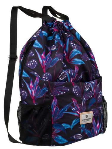 Ten stylowy worek-plecak marki Peterson® zachwyca egzotycznym wzorem w liście, które w połączeniu z intensywnymi odcieniami fuksji, niebieskiego, czerni i bieli nadają mu niepowtarzalny charakter.