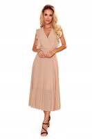 Emily - plisowana szyfonowa sukienka z dekoltem i falbankami. Spódnica została uszyta w modnej długości 7/8. Zapinana z tyłu na kryty zamek. Kolor: beżowy. Marka numoco. Produkcja polska.
