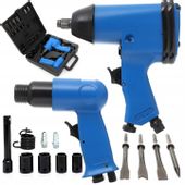 Ten bogato wyposażony zestaw zawiera wszystko, czego potrzebujesz do efektywnej pracy: klucz udarowy pneumatyczny 1/2" o momencie obrotowym 310 Nm, młot pneumatyczny blacharski 150 mm, szeroki wybór nasadek, dłut i akcesoriów. Wszystko to zostało starannie zapakowane w wytrzymałą walizkę, zapewniającą wygodny transport i przechowywanie.