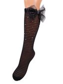 Podkolanówki w wydaniu eleganckim i z klasą. W klasycznym kolorze czarnym ze wzorem w paski. Jety i kokarda na górze skarpet dodają zabawnego, dziewczęcego akcentu.