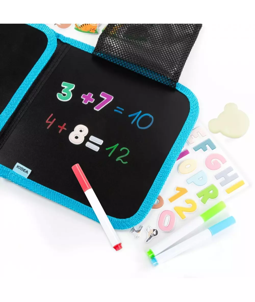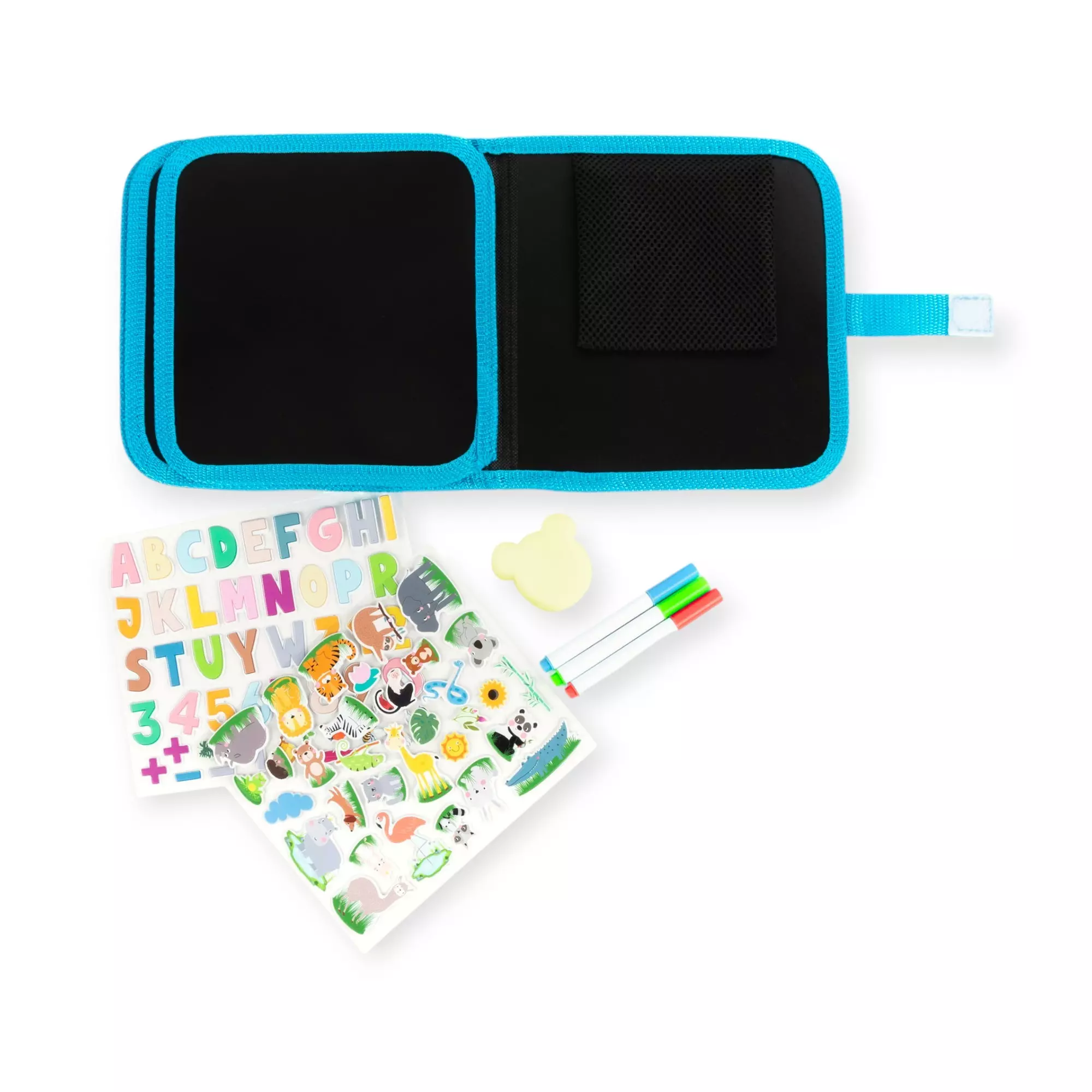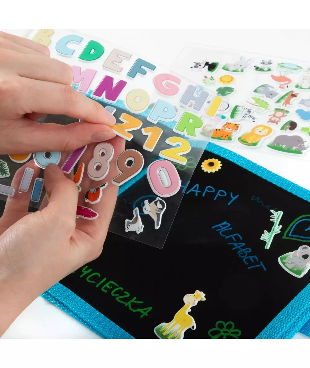 Przenośna książeczka z czarnymi zamazywanymi stronami jak mała tablica, zapinana na rzep. Bardzo przydatna dla maluchów do nauki cyferek, literek, a także rysowania. Idealna podczas podróży samochodem lub pociągiem. Jest nieduża, dzięki czemu zmieści się do każdego bagażu, a dziecko może zawsze mieć ją przy sobie. Książeczka zawiera 6 stron do nauki i zabawy. Każda z nich jest wielokrotnego użytku, możemy zmyć rysunki za pomocą mokrej szmatki lub gąbki i zacząć kolorować od nowa, naklejki też można przyklejać i odklejać. Do zestawu dołączone są trzy sztuki markerów kredowych, gąbeczka w kształcie misia oraz dwa arkusze naklejek 3D. Zeszyt jest także idealnym pomysłem na prezent.
