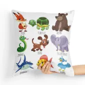 Na białym tle poduszki umieszczono kolorowe ilustracje dziesięciu zwierząt, takich jak: lis, pies, słoń, żółw, niedźwiedź, wąż, ryba czy ptak. Obrazki są zaprojektowane w przyjaznym, uśmiechniętym stylu, co ułatwia dzieciom zapamiętywanie angielskich nazw zwierząt. To nie tylko świetny pomysł na wspólną naukę, ale też atrakcyjny element dekoracyjny pokoju dziecka.