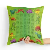 Motyw dinozaurów w intensywnych kolorach – purpurowym, zielonym, żółtym i niebieskim – przyciąga wzrok i zachęca do interakcji. Na środku poduszki znajduje się czytelna tabliczka mnożenia, nadrukowana czarną czcionką na jasnym tle, co ułatwia przyswajanie wiedzy. Sympatyczne postacie dinozaurów mają uśmiechnięte buźki, co pozytywnie wpływa na zaangażowanie dziecka w naukę.