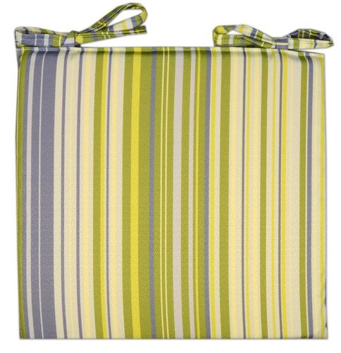 Poduszka na krzesło ogrodowe w rozmiarze 40x40 kwadratowa. Na jednym boku znajdują się 4 sznurki do wiązania na krzesło (długość sznurków to ok. 30 cm). Siedzisko na krzesło jest uszyte z tkaniny żakardowej z nadrukiem. Wypełniona jest pianką o grubości 2 cm. Poduszka jest w zielone i szare paski. Poducha na krzesło świetnie sprawdzi się zarówno jako poduszka ogrodowa jak również jako poduszka na krzesło do salonu.