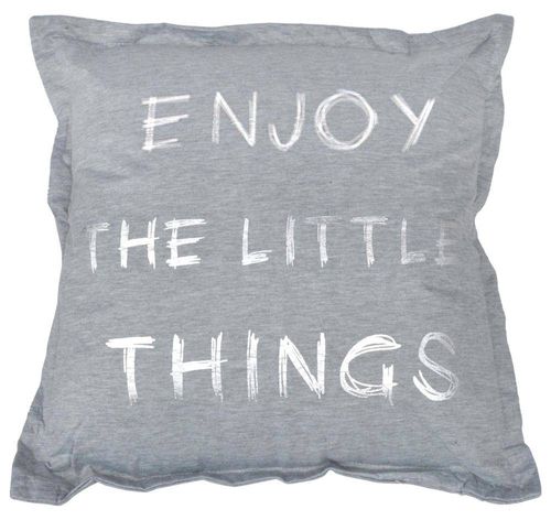 Szara poduszka ze srebrnym napisem "Enjoy the little things".