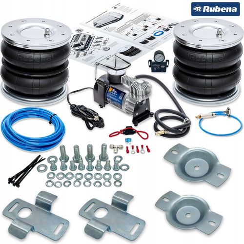 W skład zestawu wchodzą wszystkie niezbędne elementy, takie jak miechy pneumatyczne, mocowania, sterownik z manometrem, kompresor 12V 150W, zabezpieczenie prądowe, węże i złączki. To kompleksowe rozwiązanie zapewniające pełną funkcjonalność.