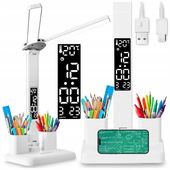 Ta wysokiej jakości podwójna lampka biurkowa LED z organizerem, wyświetlaczem temperatury, zegarem i datą wyróżnia się nie tylko eleganckim i ergonomicznym designem, ale także zaawansowanymi funkcjami. Posiada 40 diod LED (20 zimnych i 20 ciepłych), oferując 3 tryby barwy światła (3000K, 4500K, 6000K) oraz regulowaną jasność do 400 lm, co idealnie dostosowuje oświetlenie do nauki, pracy czy relaksu, zapewniając precyzyjne i komfortowe doświetlenie bez zmęczenia oczu.