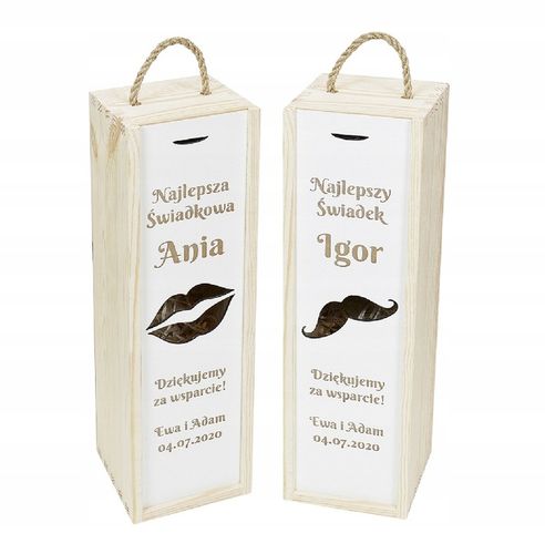 Zamiast nudnych plastikowych lub tekturowych opakowań, ten kuferek z drewna sosnowego z pewnością zaskoczy i zachwyci Waszych Świadków. Wyróżni się spośród tradycyjnych upominków, okazując szacunek i doceniając wyjątkową rolę, jaką odegrali w tym szczególnym dniu.