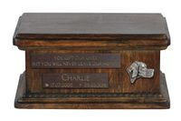 Wykonana z litego drewna brzozowego, ta niewielka urna na psie prochy o wymiarach 21 x 29 x 11 cm jest niezwykle trwała i estetyczna. Jej unikalny design zawiera srebrne ornamenty przedstawiające rasę Twojego psa, co nadaje jej niepowtarzalny charakter. Dzięki blisko 150 wzorom podobizn psów rasowych możesz wybrać ten, który najlepiej oddaje osobowość Twojego ukochanego towarzysza.