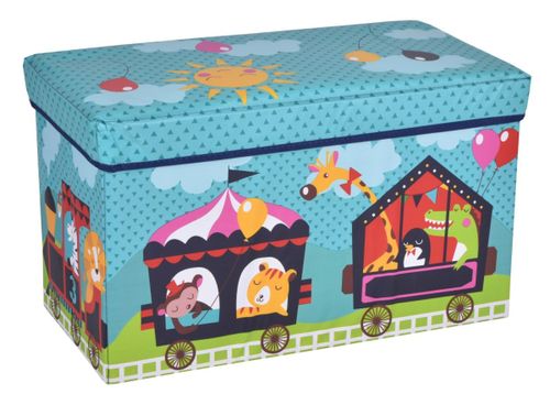 Wymiary pojemnika po rozłożeniu to 35 cm wysokości, 60 cm szerokości oraz 30 cm głębokości. Po złożeniu zajmuje jedynie 5 cm wysokości, co czyni go praktycznym rozwiązaniem dla małych przestrzeni. Pociąg w kolorach niebieskim i zielonym będzie doskonałym uzupełnieniem każdego dziecięcego królestwa.