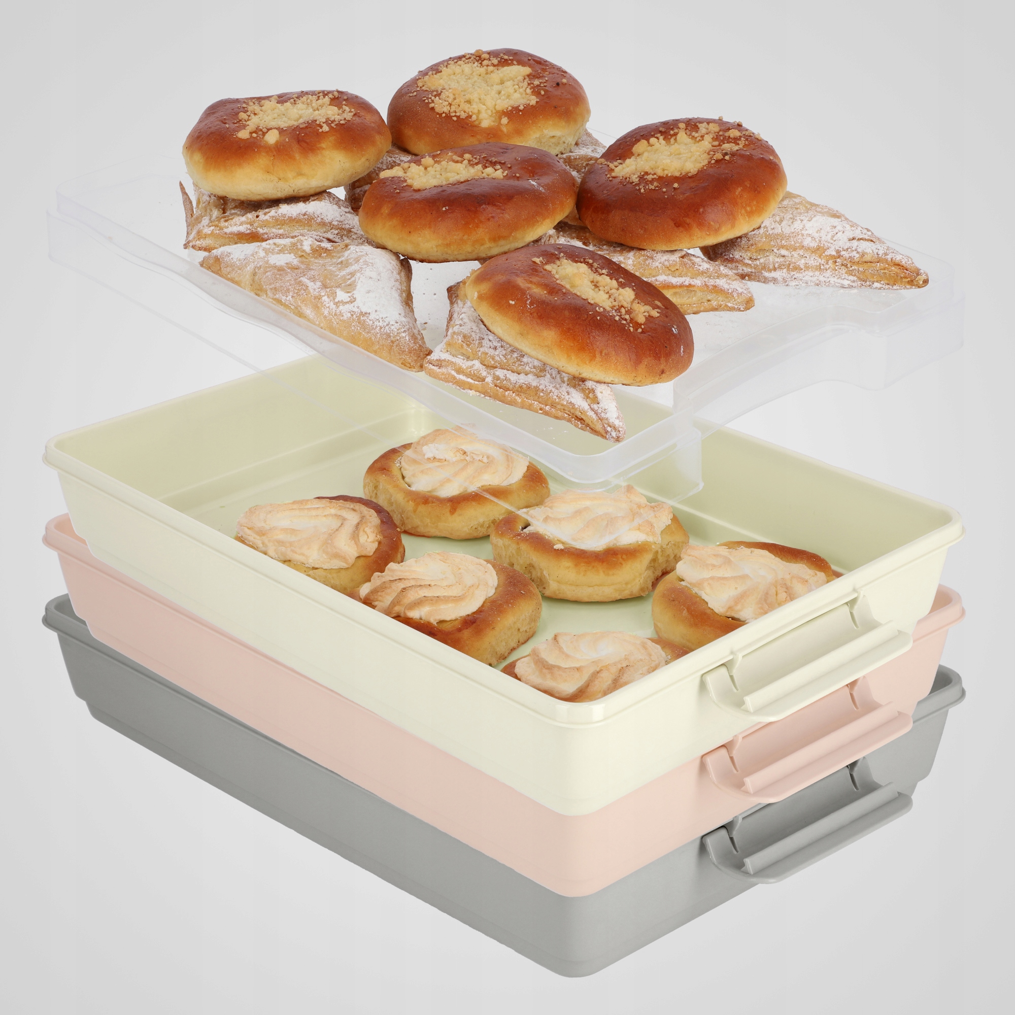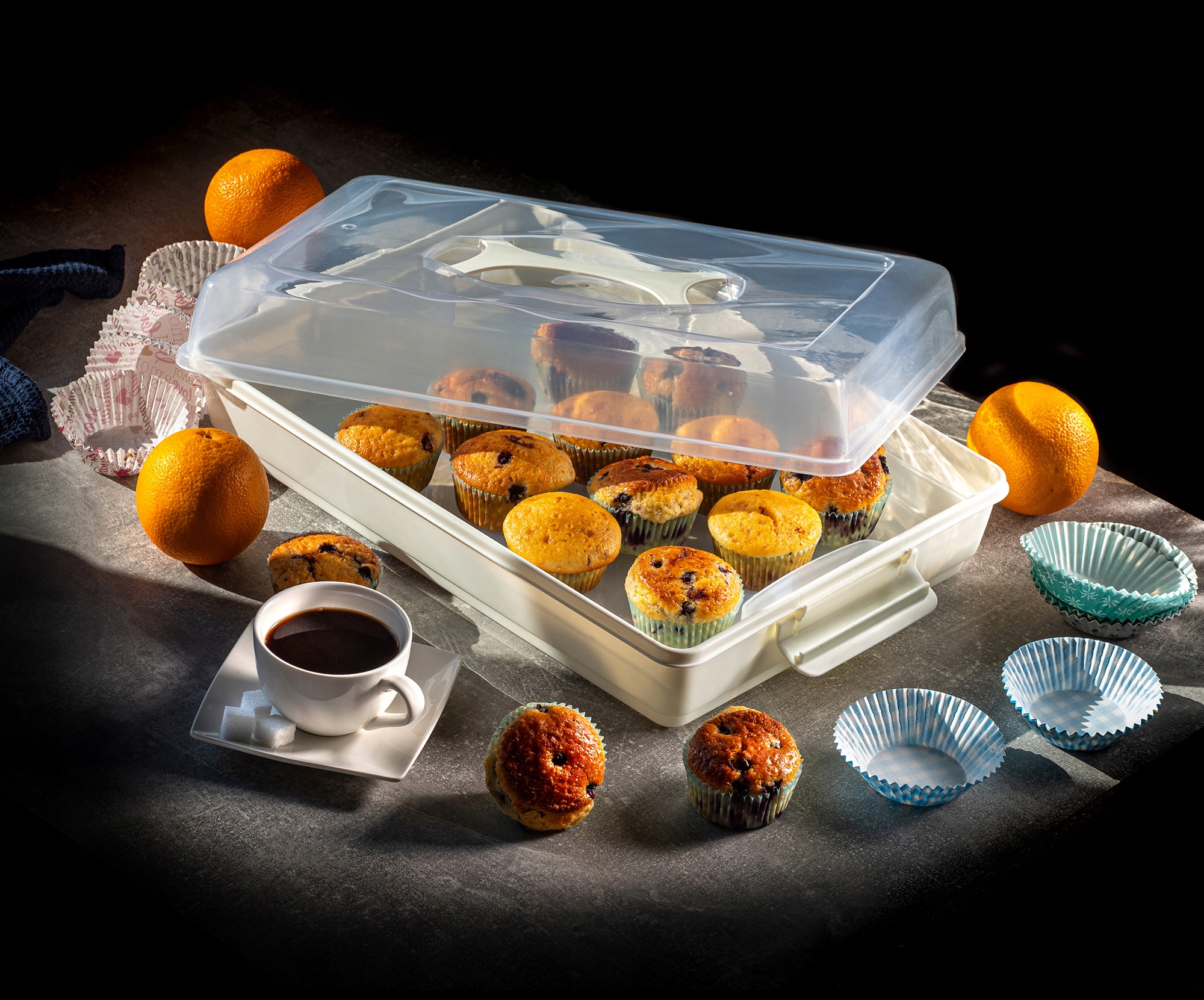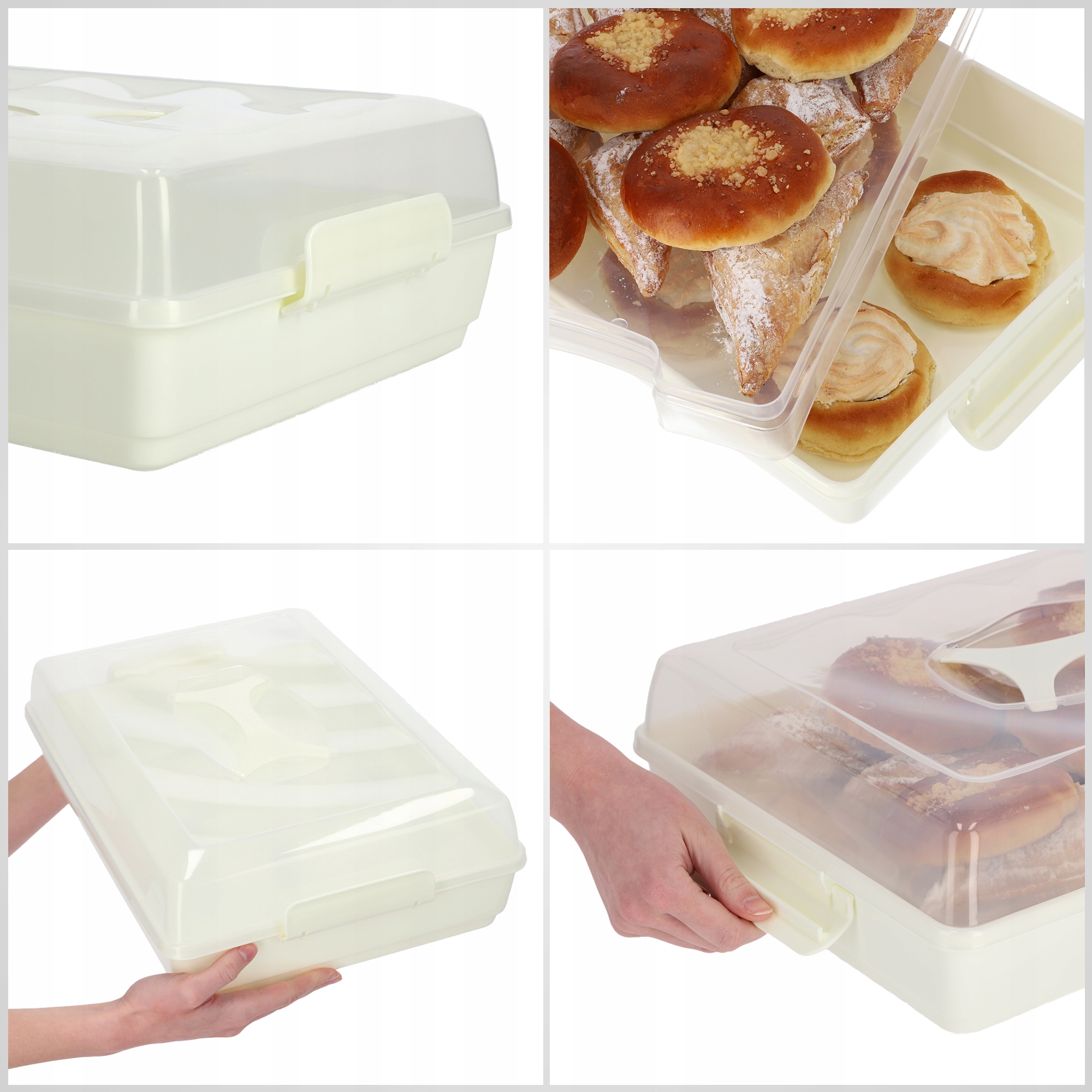 Praktyczny pojemnik świetnie nadaje się do wygodnego przenoszenia różnego rodzaju wypieków, na przykład babki piaskowej, szarlotki, sernika, bezy, ciasta czekoladowego, pyz ze szpinakiem, ale także ciasteczek, drożdżówek czy babeczek.