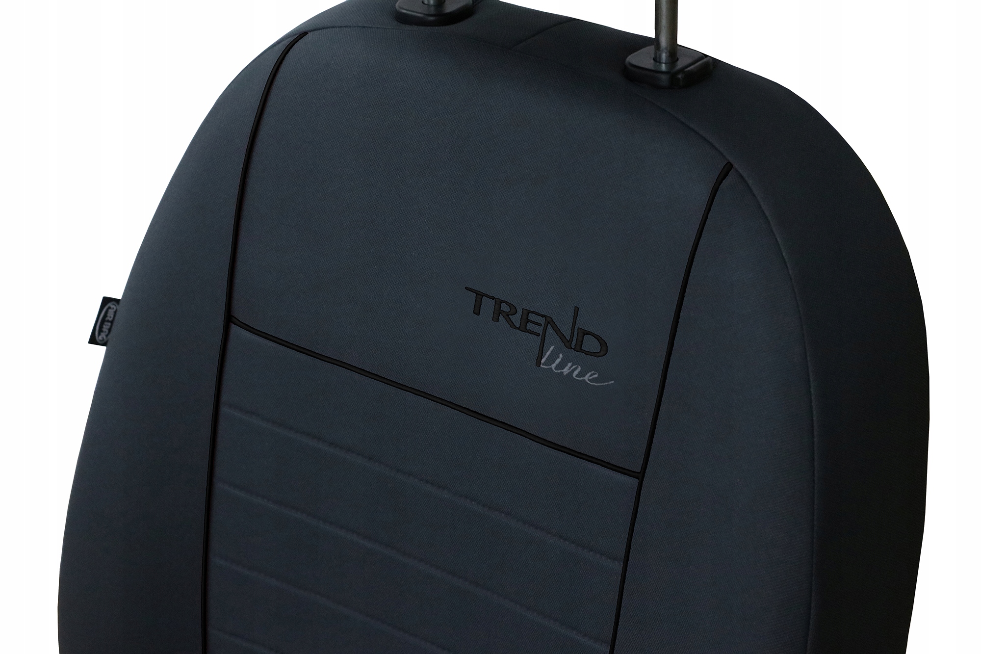 Pokrowce serii TRENDLINE zostały uszyte z dzianiny poliestrowej w kolorze szarym (popielatym). Materiał (w częściach przednich) jest dodatkowo laminowany i podszyty pianką wzmacniając pokrowce i zapobiegając ich przesuwaniu. W pozostałych częściach (oraz w zagłówkach) zastosowano sam materiał główny. Wysoka cyrkulacja powietrza zapewnia odpowiedni komfort użytkowania. W środkowych pasach zastosowano tłoczony materiał, a do złączenia poszczególnych elementów użyto lamówki. Materiał nie farbuje, nie powoduje alergii, pokrowce można prać w pralce w 30 stopniach. Plecy pokrowców przednich foteli są pełne, standardowo zastosowano szew airbag. Na frontach foteli przednich wszyto haft Trendline. Polski produkt firmy z ponad 20 letnim doświadczeniem - firma Pokter
