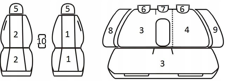 Zestaw pokrowców powstał na podstawie konkretnego modelu auta (rocznika) i pasuje tylko i wyłącznie do podanej powyżej konfiguracji siedzeń - nie jest to komplet uniwersalny. Profil, rozmiar oraz kształt foteli został uwzględniony podczas przygotowywania konkretnego produktu. Wszystkie typowe otwory zostały przygotowane i obszyte. Podłokietniki (o ile występują) zostały uwzględnione - w pierwszym rzędzie są osobne pokrowce, w kanapach zastosowano zamki błyskawiczne w odpowiednim miejscu (brak osobnego pokrowca na podłokietnik). Przednie fotele posiadają wszyte zamki błyskawiczne na plecach umożliwiające na korzystanie z kieszeni, dodatkowo w fotelu kierowcy (w siedzisku) przygotowano praktyczną kieszonkę na drobne przedmioty.
