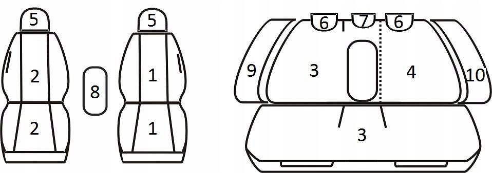 Zestaw pokrowców powstał na podstawie konkretnego modelu auta (rocznika) i pasuje tylko i wyłącznie do podanej powyżej konfiguracji siedzeń - nie jest to komplet uniwersalny. Profil, rozmiar oraz kształt foteli został uwzględniony podczas przygotowywania konkretnego produktu. Wszystkie typowe otwory zostały przygotowane i obszyte. Podłokietniki (o ile występują) zostały uwzględnione - w pierwszym rzędzie są osobne pokrowce, w kanapach zastosowano zamki błyskawiczne w odpowiednim miejscu (brak osobnego pokrowca na podłokietnik). Przednie fotele posiadają wszyte zamki błyskawiczne na plecach umożliwiające na korzystanie z kieszeni, dodatkowo w fotelu kierowcy (w siedzisku) przygotowano praktyczną kieszonkę na drobne przedmioty.